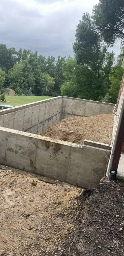 The crew excavates the site to the required depth and places compacted gravel at the bottom to create a stable base. In Dubuque, footings must be poured below the frost line to prevent heaving and cracking caused by freezing ground. Forms are set for the footings first, then for the foundation walls, and reinforcement is tied in place before any concrete is poured.